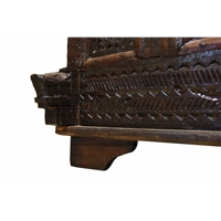 The Wooden Unit is an intricate piece of work. The piece has carvings comprising of floral borders to intricate patterns at the doors followed by a thick linear design work at the bottom strap. The product has hinges and handles made out of iron, which add to the dark texture this piece carries. This piece makes a perfect collectible along with some of the Jharokha units in the almari section. (refer to imagery)