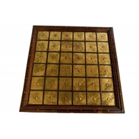 The Vintage Board is a piece loaded with heavy brass work. The top brass plate is divided into 36 boxes via iron stripes running across the top. The sides have a thick dark wooden gloss polish with brass accents at regular intervals. The foundation of this piece is placed at the center areas and not the corner of the tables, making it stand apart from the rest of the lot.